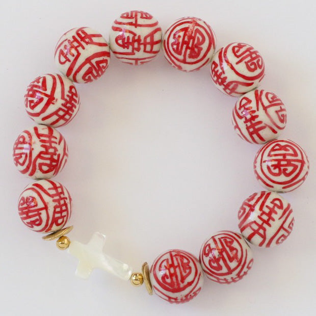Hand painted mint green and white porcelain beads featuring a mother of pearl cross bead flanked by 18k gold plated beads. Available in blue, red, rose pink, and silver.