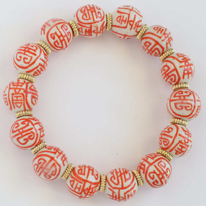 Hand painted orange and white hand painted porcelain beads featuring 18k gold plated spacer beads.